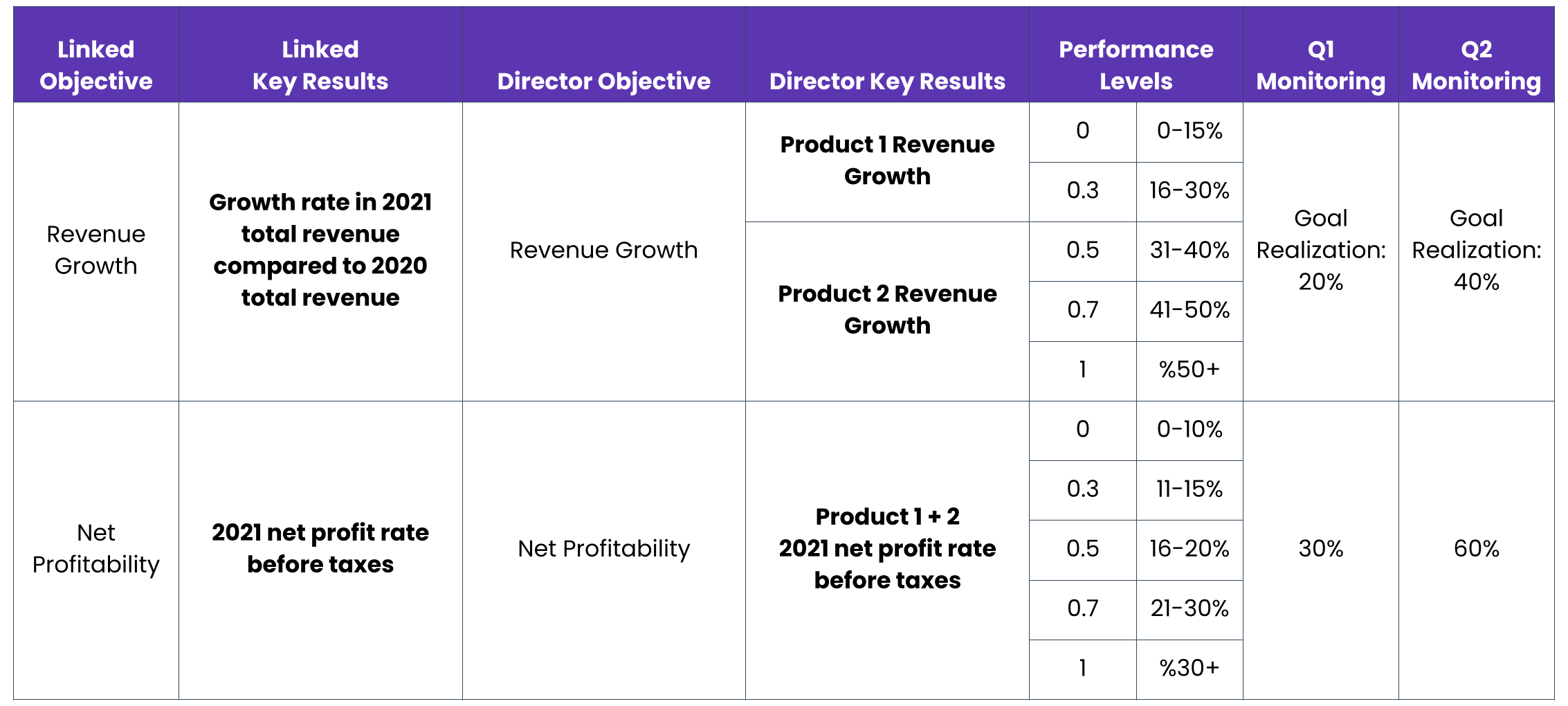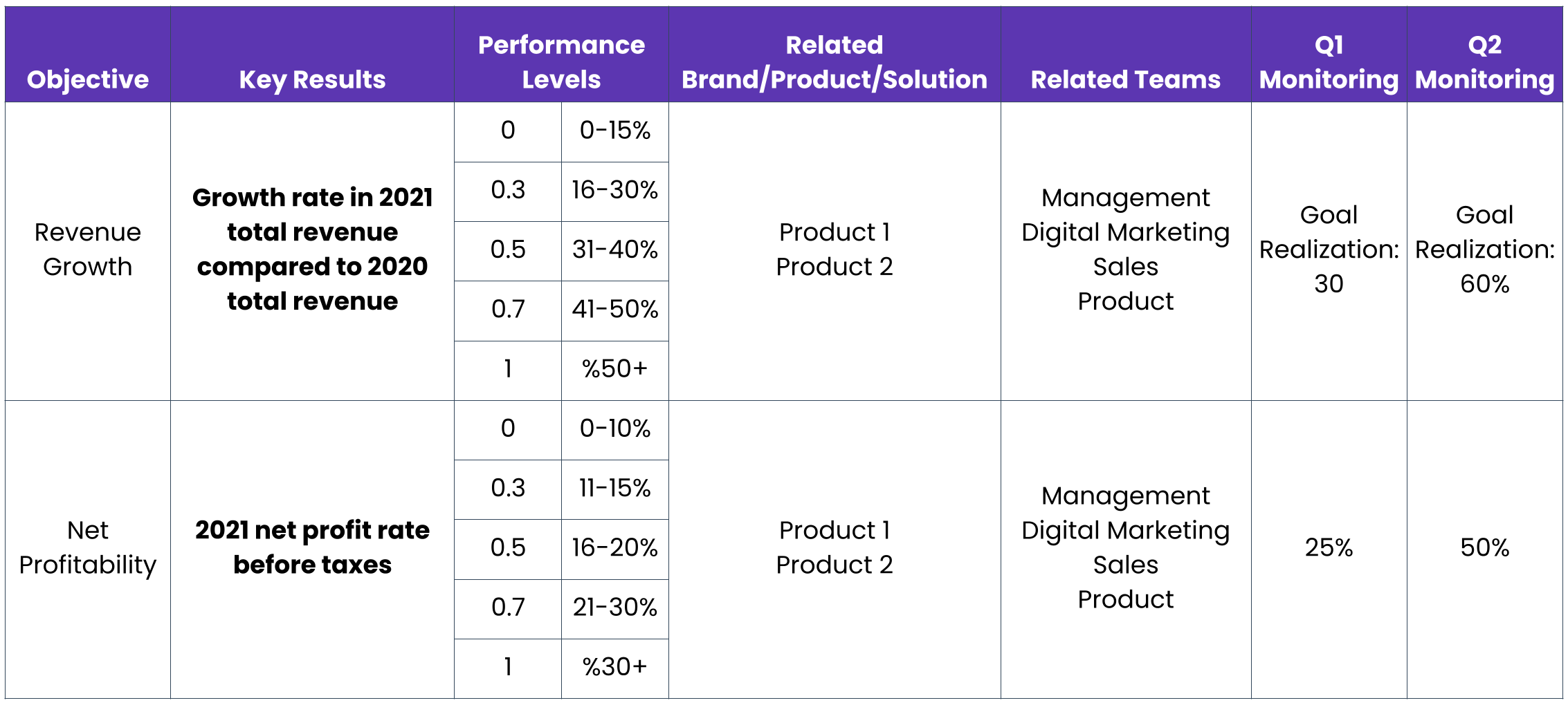 Let’s say that to grow company revenue, according to your projections, growing the user base of Product A by 15% will be helpful. You can then assign OKRs to your teams. Each team (content, performance, design, product, brand) should have certain goals to achieve, and each should be related to a bigger goal of the company. You can decide on these goals on a quarterly basis and then turn them into monthly action plans.
