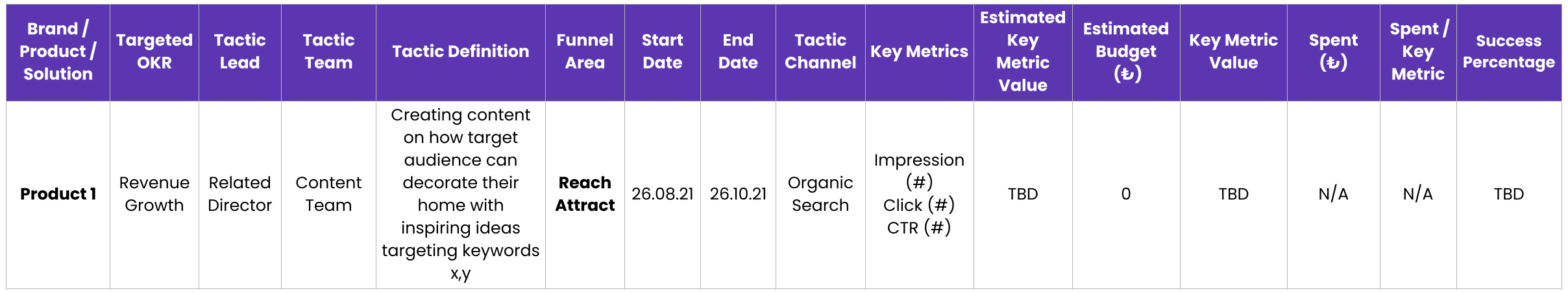 For example, to grow revenue, you need to generate more leads, and to generate more leads, you should brainstorm some tactics. One tactic can be creating a Youtube campaign targeting certain channels. Then, on a weekly basis, you can look at the numbers and monitor whether Youtube ads helped you achieve more leads. These tactics can be designed and monitored according to the Test & Learn methodology.