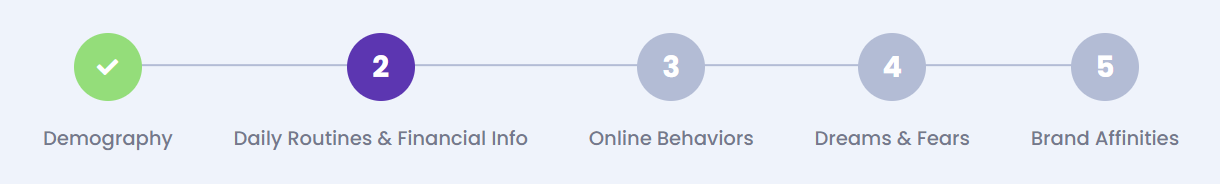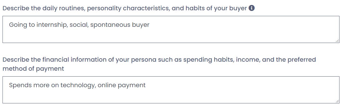 At this step, you will indicate the daily routines, habits, and financial information about your persona. Below is an example of how to describe these characteristics:
