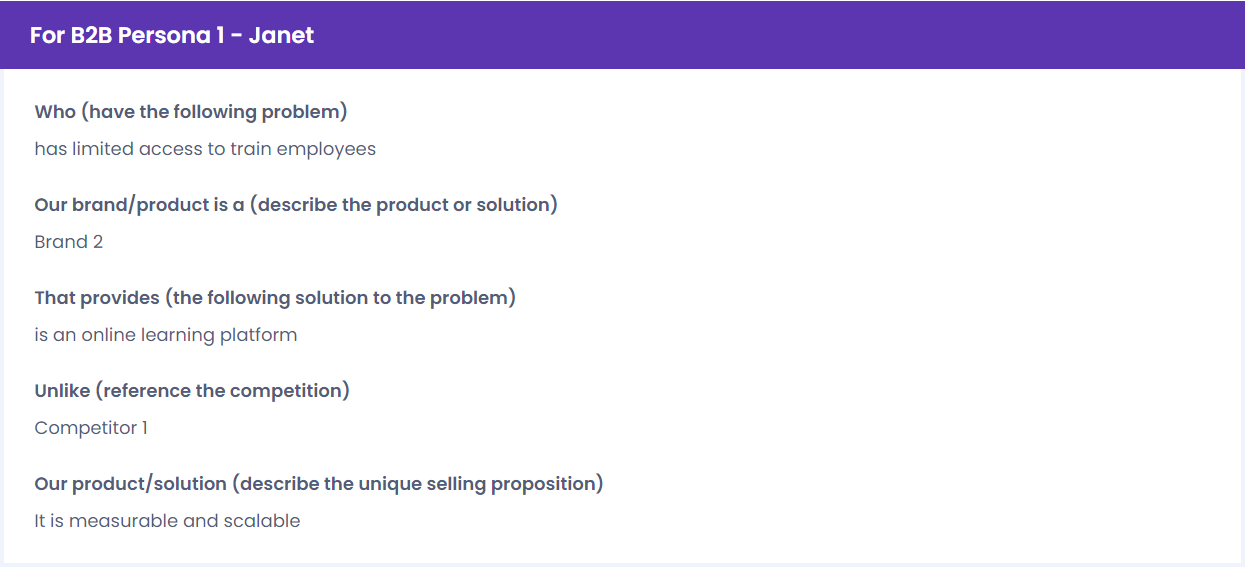 The key point here is to establish your brand’s uniqueness and identify what differentiates you from your competitors. You should fill in the following blanks: