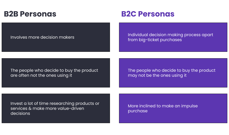 Every persona’s pain points, goals, and reason for buying your product/service will differ, so all of your marketing activities and future communications have to be done accordingly. For instance, a sales representative might be interested in a different product feature of a CRM tool than an IT manager who also uses the same product.