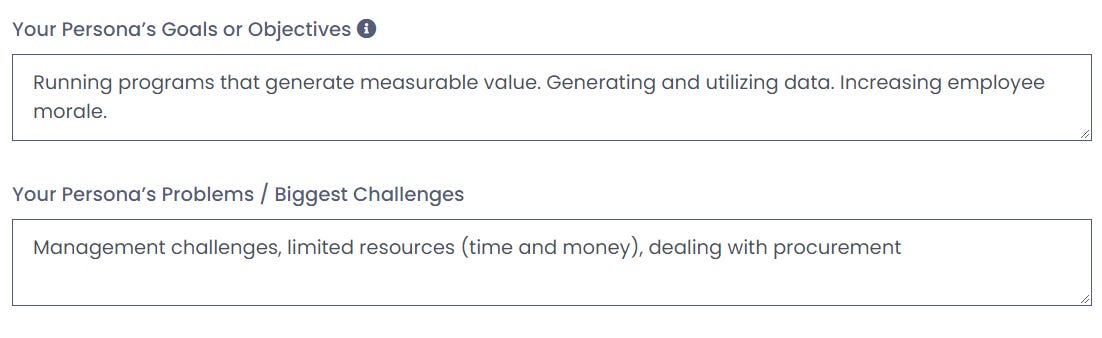 Your persona’s objectives and challenges play a big part in your future marketing activities. They will answer the question: why does this persona need my product/solution/services? So make sure you elaborate with as much information as possible to better determine how your business can meet their needs.