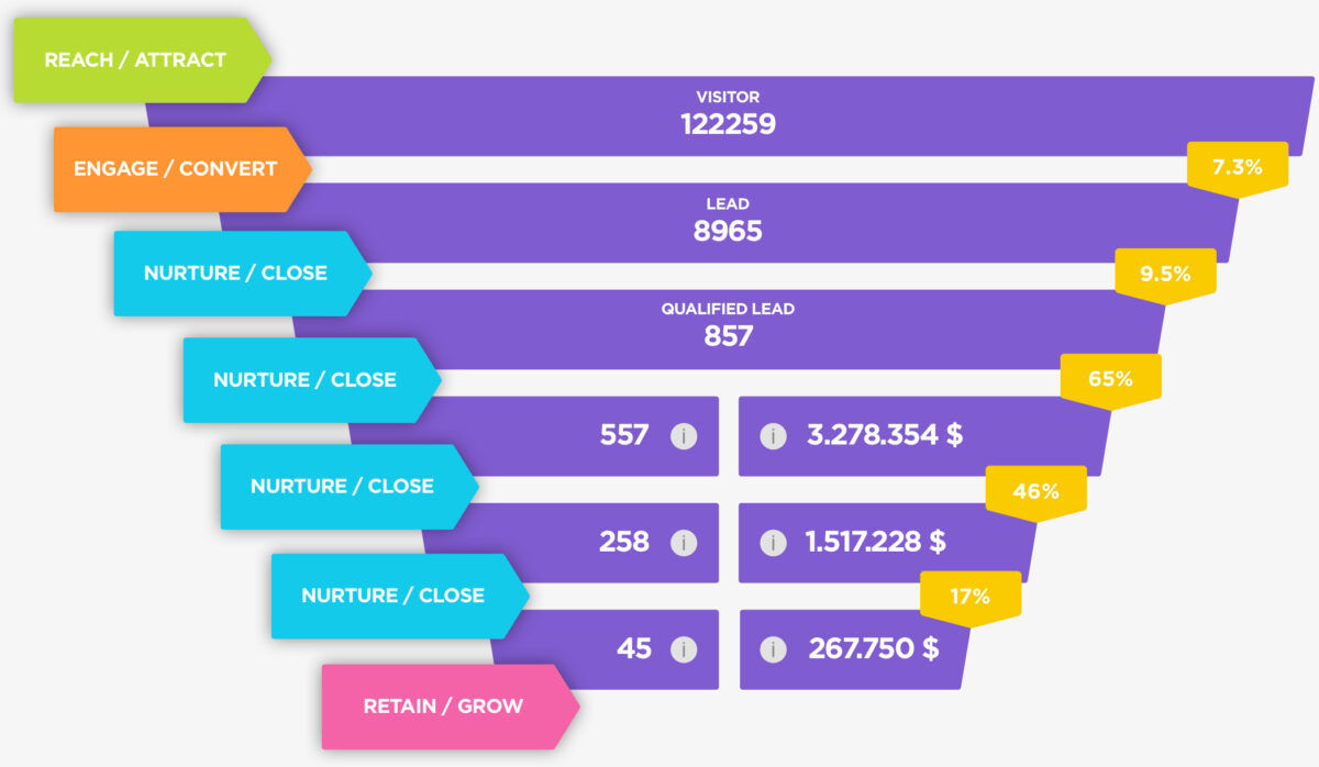 A key point at this stage is that your sales and marketing teams should collaborate and communicate well, mutually focusing on ROI (Return on Investment). In fact, many organizations are starting to create one “growth unit“ instead of separating sales and marketing teams. This way, funnel-based pipelines lead to scoring processes, and sales processes can be easily monitored and managed mutually.