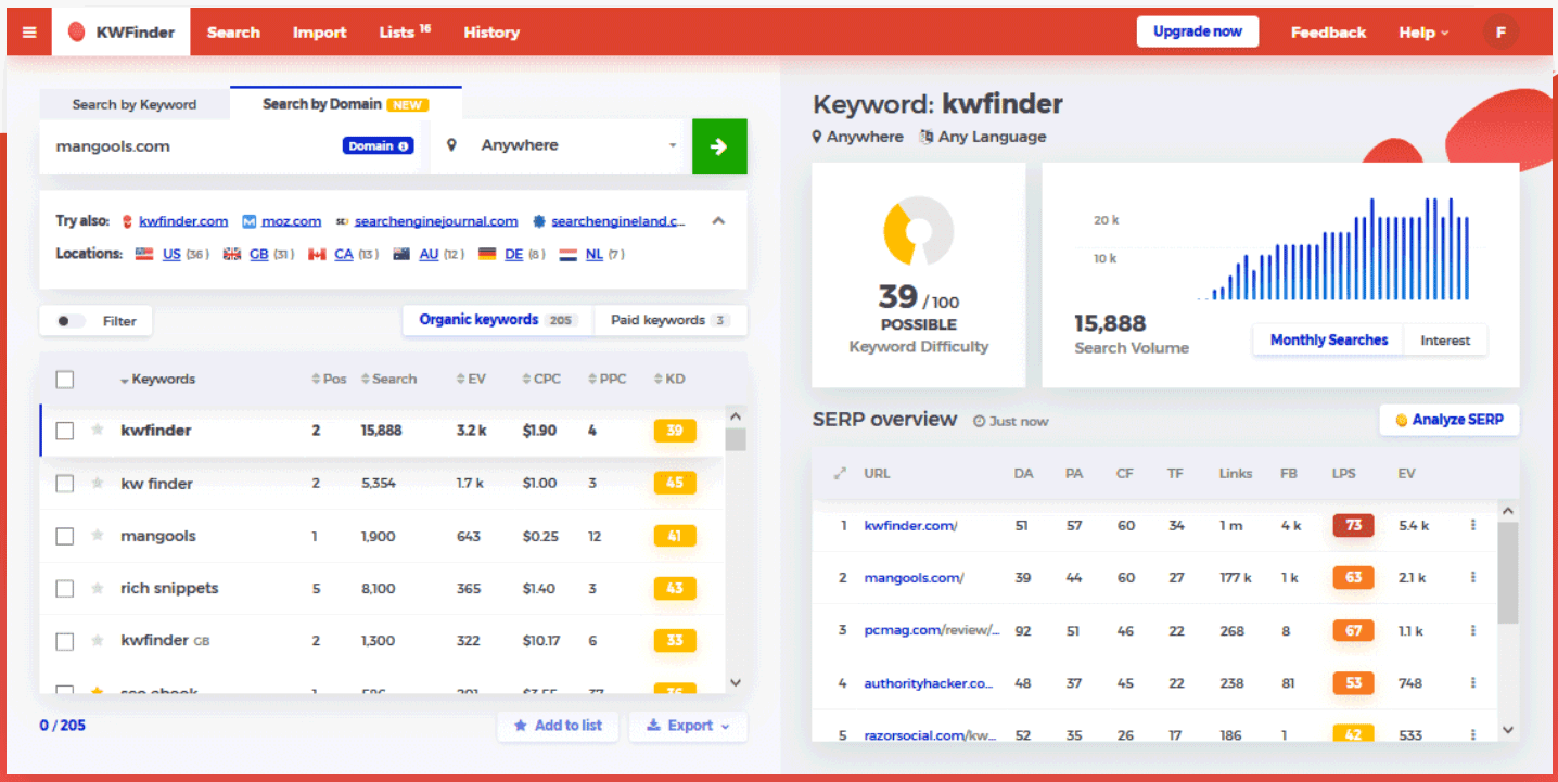 KWFinder is a powerful keyword tool that is easy to use. It offers the advantages listed below: