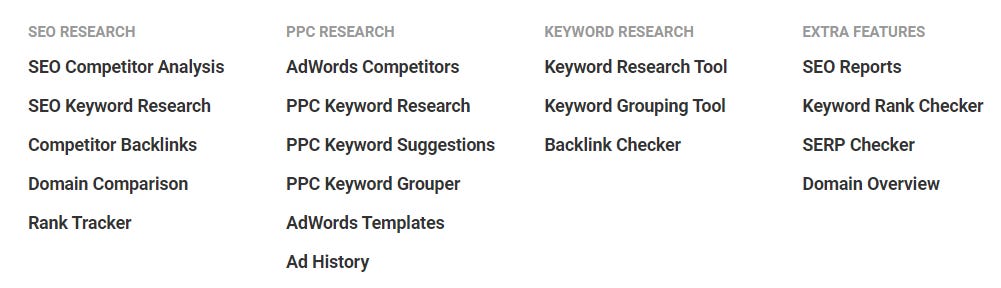 With SpyFu, you have access to tools under four main categories: SEO Research, PPC Research, Keyword Research, and some extra features: