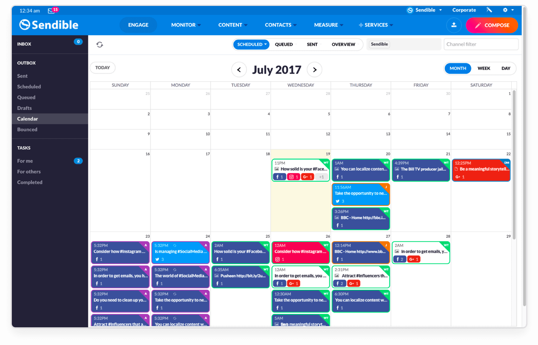 Sendible is a social media management tool used to oversee a number of social media channels for multiple brands. Built especially for agencies, this platform covers social media management from planning and collaboration to engagement and analytics. Within a single dashboard, you can plan and create content, schedule it in bulk, and manage all social media calendars.