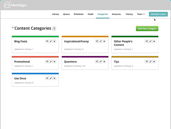 You can also build an unlimited content library and create a category-based social media calendar – blog posts on Mondays and promotions on Wednesdays. Edgar then automatically selects from your library and schedules your posts. It doesn’t ever let your evergreen content go unnoticed and re-shares your previous social media posts over time.