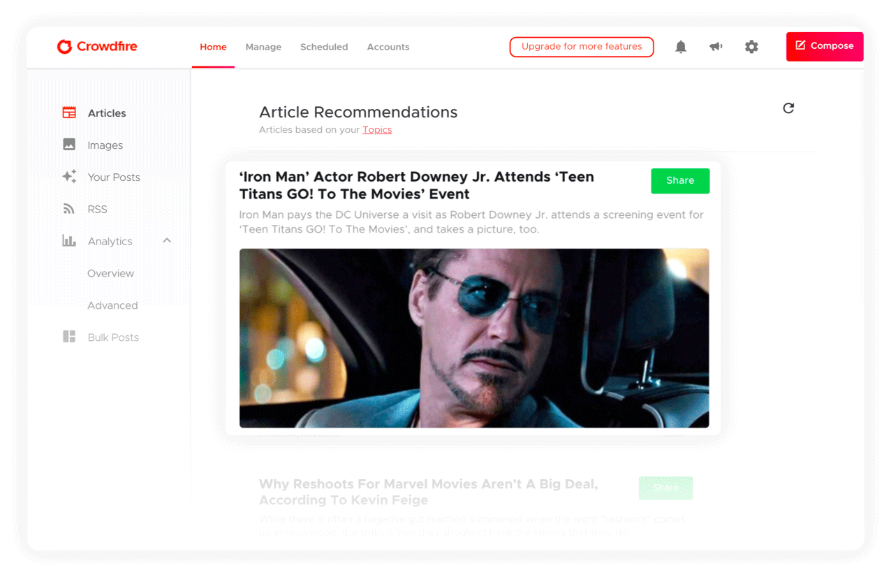 Crowdfire’s prominence is associated with two features: article curation and image curation. You decide on your social media marketing strategy and leave content creation from thousands of sources to Crowdfire.