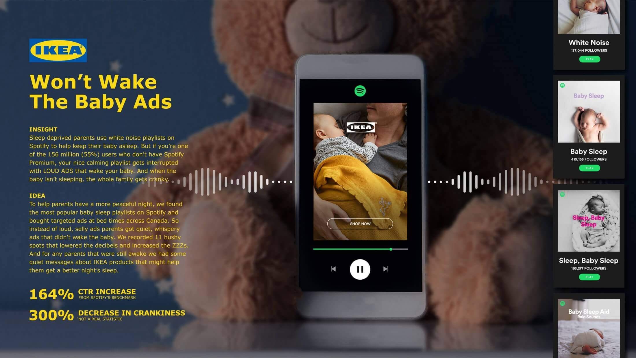 Some brands use this type of advertising creatively. When IKEA designed low-noise ads for use in baby lullaby playlists, the ads received a 164% increase in click rate compared to a standard Spotify ad.