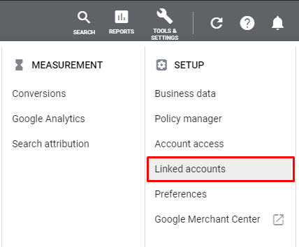 1- Log in to your Google Ads Account. Click on the Tools & Settings icon and click on the Linked Accounts under Setup menu.