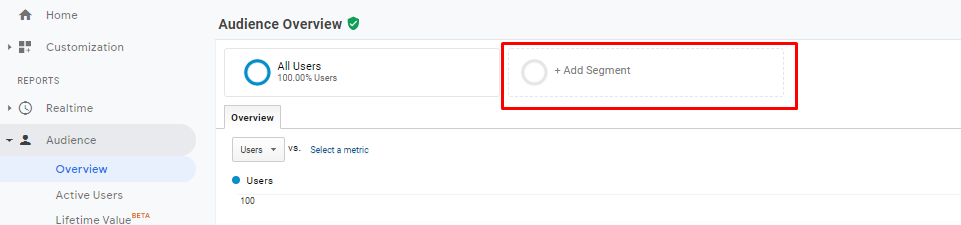 At the top of all reports, you can find information on which data belong to which segment. This section automatically comes pre-selected as “All Users”. You can select the segment you want or use the predefined segments by clicking on the “add segment” button.